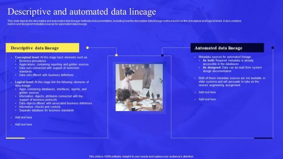 This slide depicts the descriptive and automated data lineage methods of documentation, including how the descriptive data lineage method works on the conceptual and logical levels. It also contains built-in and designed metadata sources for automated data lineage.Make sure to capture your audiences attention in your business displays with our gratis customizable Descriptive And Automated Data Lineage Deploying Data Lineage IT Microsoft PDF. These are great for business strategies, office conferences, capital raising or task suggestions. If you desire to acquire more customers for your tech business and ensure they stay satisfied, create your own sales presentation with these plain slides.