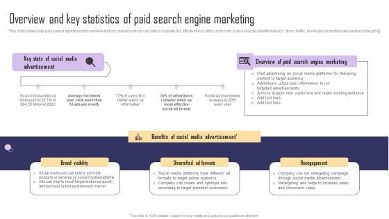 This slide showcases paid search advertisement overview and key statistics which can help to evaluate the effectiveness of this ad format. It also include benefits that are - drives traffic, eliminate competition and audience targeting. This Paid Internet Marketing Strategy Overview And Key Paid Search Engine Marketing Designs Pdf from Slidegeeks makes it easy to present information on your topic with precision. It provides customization options, so you can make changes to the colors, design, graphics, or any other component to create a unique layout. It is also available for immediate download, so you can begin using it right away. Slidegeeks has done good research to ensure that you have everything you need to make your presentation stand out. Make a name out there for a brilliant performance. This slide showcases paid search advertisement overview and key statistics which can help to evaluate the effectiveness of this ad format. It also include benefits that are - drives traffic, eliminate competition and audience targeting.