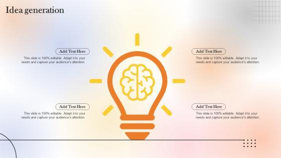 Presenting this set of slides with name idea generation ppt powerpoint presentation infographic template background designs. This is a four stage process. The stages in this process are idea generation. This is a completely editable PowerPoint presentation and is available for immediate download. Download now and impress your audience.