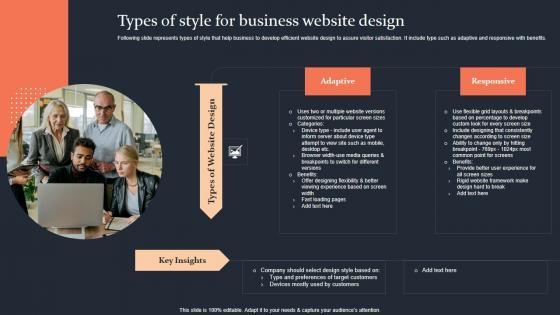 Following slide represents types of style that help business to develop efficient website design to assure visitor satisfaction. It include type such as adaptive and responsive with benefits. Slidegeeks is one of the best resources for PowerPoint templates. You can download easily and regulate Types Of Style For Business Website Design Step By Step Guide Themes PDF for your personal presentations from our wonderful collection. A few clicks is all it takes to discover and get the most relevant and appropriate templates. Use our Templates to add a unique zing and appeal to your presentation and meetings. All the slides are easy to edit and you can use them even for advertisement purposes. Following slide represents types of style that help business to develop efficient website design to assure visitor satisfaction. It include type such as adaptive and responsive with benefits.