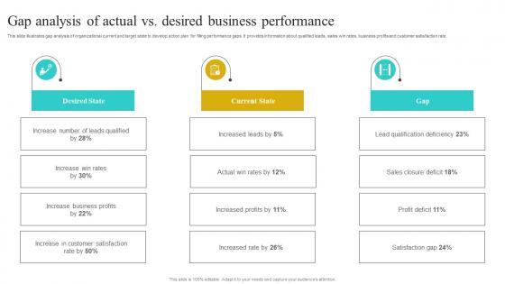 This slide illustrates gap analysis of organizational current and target state to develop action plan for filling performance gaps. It provides information about qualified leads, sales win rates, business profits and customer satisfaction rate. From laying roadmaps to briefing everything in detail, our templates are perfect for you. You can set the stage with your presentation slides. All you have to do is download these easy to edit and customizable templates. Gap Analysis Of Actual Vs Desired Business Performance Mockup PDF will help you deliver an outstanding performance that everyone would remember and praise you for. Do download this presentation today.
