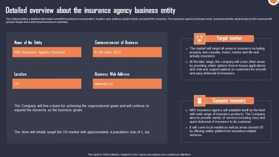 This slide provides a detailed information about the businesss incorporation, location, web-address, target market, and about the business. The insurance agency business name, business website, what all places the business will going to target and a brief about businesss summary. This Detailed Overview About The Insurance Agency Business Building An Insurance Company Themes Pdf from Slidegeeks makes it easy to present information on your topic with precision. It provides customization options, so you can make changes to the colors, design, graphics, or any other component to create a unique layout. It is also available for immediate download, so you can begin using it right away. Slidegeeks has done good research to ensure that you have everything you need to make your presentation stand out. Make a name out there for a brilliant performance. This slide provides a detailed information about the businesss incorporation, location, web-address, target market, and about the business. The insurance agency business name, business website, what all places the business will going to target and a brief about businesss summary.