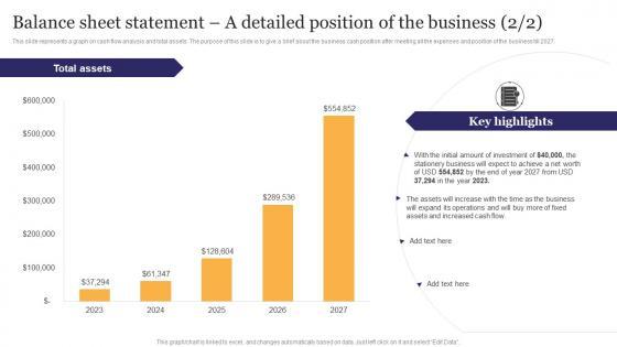 This slide represents balance sheet statement. This slide provides a brief about the business position, how much assets business is having, what is the total cash in hand bank available for further expansion, account receivables, equity and liability including retained earnings accounts payables business will have at the end of each year. Boost your pitch with our creative Balance Sheet Statement A Detailed Stationery Business Plan Go To Market Strategy Infographics Pdf. Deliver an awe inspiring pitch that will mesmerize everyone. Using these presentation templates you will surely catch everyones attention. You can browse the ppts collection on our website. We have researchers who are experts at creating the right content for the templates. So you do not have to invest time in any additional work. Just grab the template now and use them. This slide represents balance sheet statement. This slide provides a brief about the business position, how much assets business is having, what is the total cash in hand bank available for further expansion, account receivables, equity and liability including retained earnings accounts payables business will have at the end of each year.