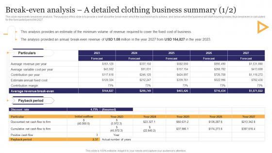 This slide represents breakeven analysis. The purpose of this slide is to provide a brief about the break even which the business has to achieve, and below which the business will start incurring losses, thus breakeven is calculated for the forecasted period till 2027. Create an editable Break Even Analysis A Detailed Stationery Business Plan Go To Market Strategy Introduction Pdf that communicates your idea and engages your audience. Whether you are presenting a business or an educational presentation, pre designed presentation templates help save time. Break Even Analysis A Detailed Stationery Business Plan Go To Market Strategy Introduction Pdf is highly customizable and very easy to edit, covering many different styles from creative to business presentations. Slidegeeks has creative team members who have crafted amazing templates. So, go and get them without any delay. This slide represents breakeven analysis. The purpose of this slide is to provide a brief about the break even which the business has to achieve, and below which the business will start incurring losses, thus breakeven is calculated for the forecasted period till 2027.