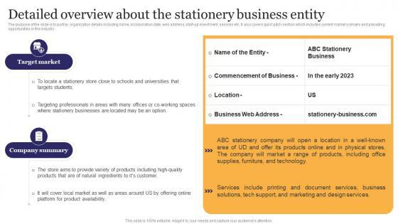 The purpose of the slide is to portray organization details including name, incorporation date, web address, start up investment, services etc. It also covers quick pitch section which includes current market scenario and prevailing opportunities in the industry. Present like a pro with Detailed Overview About The Stationery Business Plan Go To Market Strategy Icons Pdf Create beautiful presentations together with your team, using our easy to use presentation slides. Share your ideas in real time and make changes on the fly by downloading our templates. So whether you are in the office, on the go, or in a remote location, you can stay in sync with your team and present your ideas with confidence. With Slidegeeks presentation got a whole lot easier. Grab these presentations today. The purpose of the slide is to portray organization details including name, incorporation date, web address, start up investment, services etc. It also covers quick pitch section which includes current market scenario and prevailing opportunities in the industry.