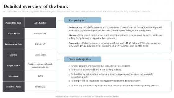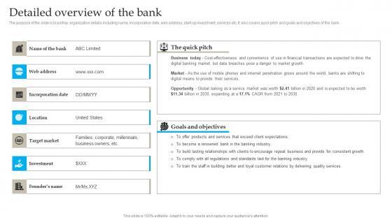 The purpose of the slide is to portray organization details including name, incorporation date, web address, start up investment, services etc. It also covers quick pitch and goals and objectives of the bank. Do you have an important presentation coming up Are you looking for something that will make your presentation stand out from the rest Look no further than Detailed Overview Of The Bank Banking Industry Business Plan Go To Market Strategy Formats Pdf. With our professional designs, you can trust that your presentation will pop and make delivering it a smooth process. And with Slidegeeks, you can trust that your presentation will be unique and memorable. So why wait Grab Detailed Overview Of The Bank Banking Industry Business Plan Go To Market Strategy Formats Pdf today and make your presentation stand out from the rest The purpose of the slide is to portray organization details including name, incorporation date, web address, start up investment, services etc. It also covers quick pitch and goals and objectives of the bank.