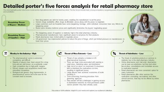 The slide highlights porters five forces model and its implications in the US retail pharmacy store. The five forces include rivalry among competitors, bargaining power of buyers and suppliers, and the threat of new entrants and substitutes. Whether you have daily or monthly meetings, a brilliant presentation is necessary. Detailed Porters Five Forces Analysis Pharmacy Business Plan Go To Market Strategy Background Pdf can be your best option for delivering a presentation. Represent everything in detail using Detailed Porters Five Forces Analysis Pharmacy Business Plan Go To Market Strategy Background Pdf and make yourself stand out in meetings. The template is versatile and follows a structure that will cater to your requirements. All the templates prepared by Slidegeeks are easy to download and edit. Our research experts have taken care of the corporate themes as well. So, give it a try and see the results. The slide highlights porters five forces model and its implications in the US retail pharmacy store. The five forces include rivalry among competitors, bargaining power of buyers and suppliers, and the threat of new entrants and substitutes.