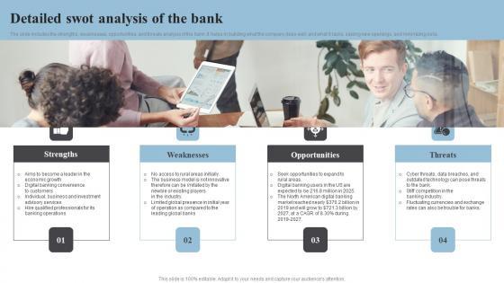 The slide includes the strengths, weaknesses, opportunities, and threats analysis of the bank. It helps in building what the company does well, and what it lacks, seizing new openings, and minimizing risks. Whether you have daily or monthly meetings, a brilliant presentation is necessary. Detailed Swot Analysis Of The Bank Banking Industry Business Plan Go To Market Strategy Clipart Pdf can be your best option for delivering a presentation. Represent everything in detail using Detailed Swot Analysis Of The Bank Banking Industry Business Plan Go To Market Strategy Clipart Pdf and make yourself stand out in meetings. The template is versatile and follows a structure that will cater to your requirements. All the templates prepared by Slidegeeks are easy to download and edit. Our research experts have taken care of the corporate themes as well. So, give it a try and see the results. The slide includes the strengths, weaknesses, opportunities, and threats analysis of the bank. It helps in building what the company does well, and what it lacks, seizing new openings, and minimizing risks.