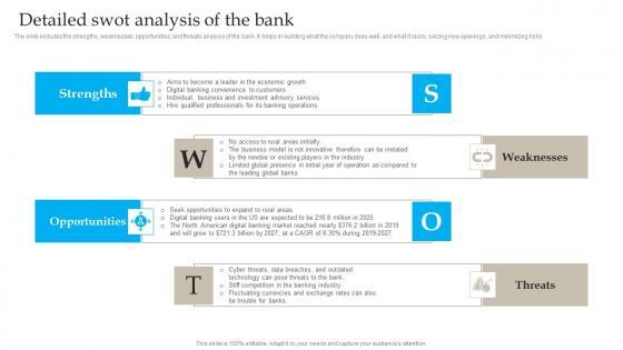 The slide includes the strengths, weaknesses, opportunities, and threats analysis of the bank. It helps in building what the company does well, and what it lacks, seizing new openings, and minimizing risks. Whether you have daily or monthly meetings, a brilliant presentation is necessary. Detailed Swot Analysis Banking Start Up B Plan Go To Market Strategy Pictures Pdf can be your best option for delivering a presentation. Represent everything in detail using Detailed Swot Analysis Banking Start Up B Plan Go To Market Strategy Pictures Pdf and make yourself stand out in meetings. The template is versatile and follows a structure that will cater to your requirements. All the templates prepared by Slidegeeks are easy to download and edit. Our research experts have taken care of the corporate themes as well. So, give it a try and see the results. The slide includes the strengths, weaknesses, opportunities, and threats analysis of the bank. It helps in building what the company does well, and what it lacks, seizing new openings, and minimizing risks.