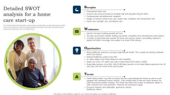 The slide includes the strengths, weaknesses, opportunities, and threats analysis of the home care start up. It helps in building what the company does well, and what it lacks, seizing new openings, and minimizing risks. Present like a pro with Detailed Swot Analysis For A Home Elderly Care Business Plan Go To Market Strategy Elements Pdf Create beautiful presentations together with your team, using our easy to use presentation slides. Share your ideas in real time and make changes on the fly by downloading our templates. So whether you are in the office, on the go, or in a remote location, you can stay in sync with your team and present your ideas with confidence. With Slidegeeks presentation got a whole lot easier. Grab these presentations today. The slide includes the strengths, weaknesses, opportunities, and threats analysis of the home care start up. It helps in building what the company does well, and what it lacks, seizing new openings, and minimizing risks.