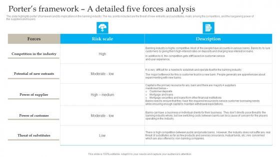 The slide highlights porters framework and its implications in the banking industry. The key points included are the threat of new entrants and substitutes, rivalry among the competitors, and the bargaining power of the suppliers and buyers. Explore a selection of the finest Porters Framework A Detailed Five Banking Start Up B Plan Go To Market Strategy Information Pdf here. With a plethora of professionally designed and pre made slide templates, you can quickly and easily find the right one for your upcoming presentation. You can use our Porters Framework A Detailed Five Banking Start Up B Plan Go To Market Strategy Information Pdf to effectively convey your message to a wider audience. Slidegeeks has done a lot of research before preparing these presentation templates. The content can be personalized and the slides are highly editable. Grab templates today from Slidegeeks. The slide highlights porters framework and its implications in the banking industry. The key points included are the threat of new entrants and substitutes, rivalry among the competitors, and the bargaining power of the suppliers and buyers.