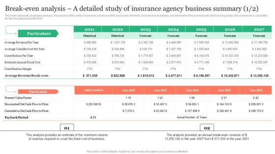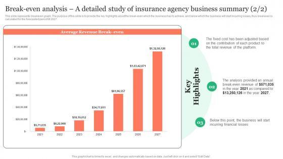 This slide represents breakeven analysis. The purpose of this slide is to provide a brief about the break-even which the business has to achieve, and below which the business will start incurring losses, thus breakeven is calculated for the forecasted period till 2027. Slidegeeks is one of the best resources for PowerPoint templates. You can download easily and regulate Break Even Analysis A Detailed Study Of Insurance Insurance Business Plan Infographics Pdf for your personal presentations from our wonderful collection. A few clicks is all it takes to discover and get the most relevant and appropriate templates. Use our Templates to add a unique zing and appeal to your presentation and meetings. All the slides are easy to edit and you can use them even for advertisement purposes. This slide represents breakeven analysis. The purpose of this slide is to provide a brief about the break-even which the business has to achieve, and below which the business will start incurring losses, thus breakeven is calculated for the forecasted period till 2027.