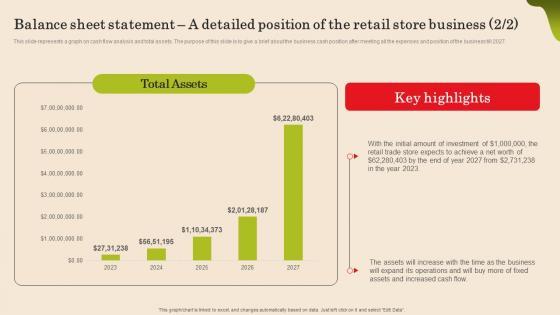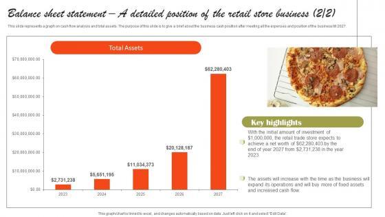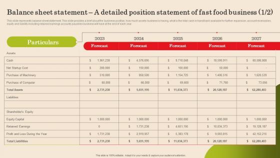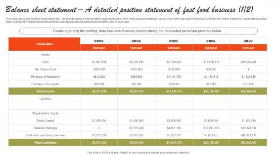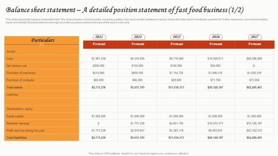 This slide represents balance sheet statement. This slide provides a brief about the business position, how much assets business is having, what is the total cash in hand or bank available for further expansion, account receivables, equity and liability including retained earnings accounts payables business will have at the end of each year.Create an editable Balance Sheet Statement A Detailed Position Small Fast Food Business Plan Portrait Pdf that communicates your idea and engages your audience. Whether you are presenting a business or an educational presentation, pre-designed presentation templates help save time. Balance Sheet Statement A Detailed Position Small Fast Food Business Plan Portrait Pdf is highly customizable and very easy to edit, covering many different styles from creative to business presentations. Slidegeeks has creative team members who have crafted amazing templates. So, go and get them without any delay. This slide represents balance sheet statement. This slide provides a brief about the business position, how much assets business is having, what is the total cash in hand or bank available for further expansion, account receivables, equity and liability including retained earnings accounts payables business will have at the end of each year.