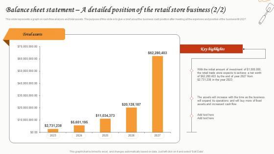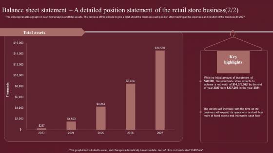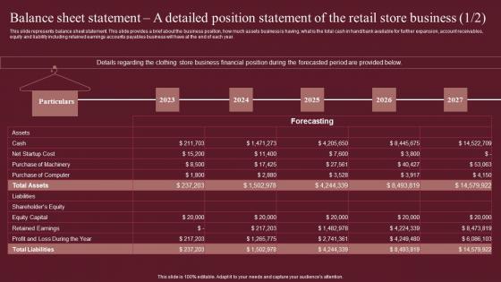 This slide represents balance sheet statement. This slide provides a brief about the business position, how much assets business is having, what is the total cash in hand bank available for further expansion, account receivables, equity and liability including retained earnings accounts payables business will have at the end of each year. Create an editable Balance Sheet Statement A Detailed Position Statement Fashion Business Plan Infographics Pdf that communicates your idea and engages your audience. Whether you are presenting a business or an educational presentation, pre-designed presentation templates help save time. Balance Sheet Statement A Detailed Position Statement Fashion Business Plan Infographics Pdf is highly customizable and very easy to edit, covering many different styles from creative to business presentations. Slidegeeks has creative team members who have crafted amazing templates. So, go and get them without any delay. This slide represents balance sheet statement. This slide provides a brief about the business position, how much assets business is having, what is the total cash in hand bank available for further expansion, account receivables, equity and liability including retained earnings accounts payables business will have at the end of each year.