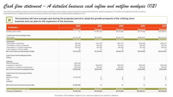 This slide represents the businesss historical and forecasted cash flow results and the amount of cash the business will introduce to starts its operations. The slide is presented to know the business cash performance, weather the business is heaving a positive cash balance and meeting all the obligations or not. Do you have to make sure that everyone on your team knows about any specific topic I yes, then you should give Cash Flow Statement A Detailed Business Cash Inflow Fashion Business Plan Themes Pdf a try. Our experts have put a lot of knowledge and effort into creating this impeccable Cash Flow Statement A Detailed Business Cash Inflow Fashion Business Plan Themes Pdf. You can use this template for your upcoming presentations, as the slides are perfect to represent even the tiniest detail. You can download these templates from the Slidegeeks website and these are easy to edit. So grab these today This slide represents the businesss historical and forecasted cash flow results and the amount of cash the business will introduce to starts its operations. The slide is presented to know the business cash performance, weather the business is heaving a positive cash balance and meeting all the obligations or not.