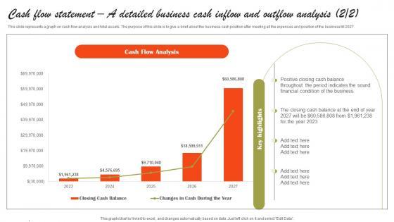 This slide represents a graph on cash flow analysis and total assets. The purpose of this slide is to give a brief about the business cash position after meeting all the expenses and position of the business till 2027. Boost your pitch with our creative Cash Flow Statement A Detailed Insurance Agency Startup Business Plan Go To Market Strategy Rules Pdf. Deliver an awe-inspiring pitch that will mesmerize everyone. Using these presentation templates you will surely catch everyones attention. You can browse the ppts collection on our website. We have researchers who are experts at creating the right content for the templates. So you do not have to invest time in any additional work. Just grab the template now and use them. This slide represents a graph on cash flow analysis and total assets. The purpose of this slide is to give a brief about the business cash position after meeting all the expenses and position of the business till 2027.