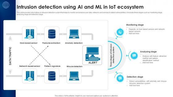 This slide provides information on intrusion detection system that helps to monitor and analyse user data, networks and services to detect vulnerabilities. It includes three stages such as monitoring stage, analysing stage and detection stage. This Building Trust With IoT Security Intrusion Detection Using AI And ML In IoT Ecosystem IoT SS V is perfect for any presentation, be it in front of clients or colleagues. It is a versatile and stylish solution for organizing your meetings. The Building Trust With IoT Security Intrusion Detection Using AI And ML In IoT Ecosystem IoT SS V features a modern design for your presentation meetings. The adjustable and customizable slides provide unlimited possibilities for acing up your presentation. Slidegeeks has done all the homework before launching the product for you. So, do not wait, grab the presentation templates today This slide provides information on intrusion detection system that helps to monitor and analyse user data, networks and services to detect vulnerabilities. It includes three stages such as monitoring stage, analysing stage and detection stage.