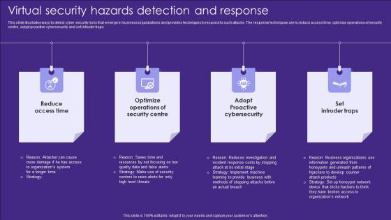 This slide illustrates ways to detect cyber security risks that emerge in business organizations and provides techniques to respond to such attacks. The response techniques are to reduce access time, optimize operations of security centre, adopt proactive cybersecurity and set intruder traps Showcasing this set of slides titled Virtual Security Hazards Detection And Response Topics Pdf. The topics addressed in these templates are Security Centre, Access Time, Cybersecurity. All the content presented in this PPT design is completely editable. Download it and make adjustments in color, background, font etc. as per your unique business setting. This slide illustrates ways to detect cyber security risks that emerge in business organizations and provides techniques to respond to such attacks. The response techniques are to reduce access time, optimize operations of security centre, adopt proactive cybersecurity and set intruder traps
