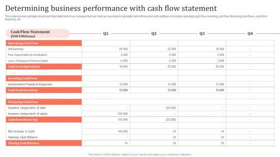 This slide provides glimpse about cash flow statement of our company that can help our business to calculate cash inflows and cash outflows. It includes operating cash flow, investing cash flow, financing cash flows, cash from financing, etc.Retrieve professionally designed Determining Business Performance With Cash Flow Tactical Financial Governance Elements Pdf to effectively convey your message and captivate your listeners. Save time by selecting pre-made slideshows that are appropriate for various topics, from business to educational purposes. These themes come in many different styles, from creative to corporate, and all of them are easily adjustable and can be edited quickly. Access them as PowerPoint templates or as Google Slides themes. You do not have to go on a hunt for the perfect presentation because Slidegeeks got you covered from everywhere. This slide provides glimpse about cash flow statement of our company that can help our business to calculate cash inflows and cash outflows. It includes operating cash flow, investing cash flow, financing cash flows, cash from financing, etc.
