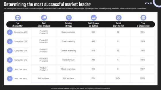 The following slide outlines the most successful competitor. Information covered in this slide is related to competitor type, top selling products, marketing strategy, total sales, market share and year of establishment. Use it with Google Slides or PowerPoint. Include striking photographs, symbols, depictions, and other visuals. Fill, move around, or remove text boxes as desired. Test out color palettes and font mixtures. Edit and save your work, or work with colleagues. Download Determining Most Successful Brand Building Techniques To Gain Competitive Edge Introduction Pdf and observe how to make your presentation outstanding. Give an impeccable presentation to your group and make your presentation unforgettable. The following slide outlines the most successful competitor. Information covered in this slide is related to competitor type, top selling products, marketing strategy, total sales, market share and year of establishment.
