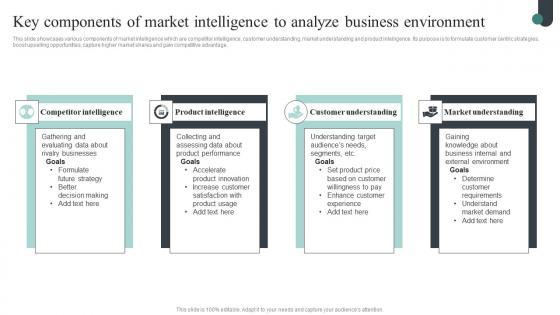 This slide showcases various components of market intelligence which are competitor intelligence, customer understanding, market understanding and product intelligence. Its purpose is to formulate customer centric strategies, boost upselling opportunities, capture higher market shares and gain competitive advantage. Crafting an eye-catching presentation has never been more straightforward. Let your presentation shine with this tasteful yet straightforward Competitive Intelligence Guide To Determine Market Key Components Of Market Intelligence Rules Pdf template. It offers a minimalistic and classy look that is great for making a statement. The colors have been employed intelligently to add a bit of playfulness while still remaining professional. Construct the ideal Competitive Intelligence Guide To Determine Market Key Components Of Market Intelligence Rules Pdf that effortlessly grabs the attention of your audience. Begin now and be certain to wow your customers. This slide showcases various components of market intelligence which are competitor intelligence, customer understanding, market understanding and product intelligence. Its purpose is to formulate customer centric strategies, boost upselling opportunities, capture higher market shares and gain competitive advantage.