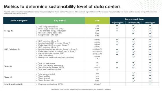 This slide outlines the critical metrics for determining the sustainability level of data centers. The purpose of this slide is to highlight the main KPIs to assess the sustainability level of data centers, covering energy, GHS emissions, water, waste, land and biodiversity.This Metrics To Determine Sustainability Level Of Data Centers Eco Friendly Computing IT from Slidegeeks makes it easy to present information on your topic with precision. It provides customization options, so you can make changes to the colors, design, graphics, or any other component to create a unique layout. It is also available for immediate download, so you can begin using it right away. Slidegeeks has done good research to ensure that you have everything you need to make your presentation stand out. Make a name out there for a brilliant performance. This slide outlines the critical metrics for determining the sustainability level of data centers. The purpose of this slide is to highlight the main KPIs to assess the sustainability level of data centers, covering energy, GHS emissions, water, waste, land and biodiversity.