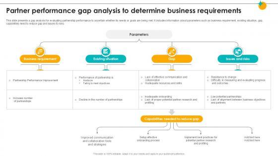 This slide presents a gap analysis for evaluating partnership performance to ascertain whether its needs or goals are being met. It includes information about parameters such as business requirement, existing situation, gap, capabilities need to reduce gap and issues and risks. Crafting an eye-catching presentation has never been more straightforward. Let your presentation shine with this tasteful yet straightforward Partner Performance Gap Analysis To Determine Partner Relationship Ppt Example template. It offers a minimalistic and classy look that is great for making a statement. The colors have been employed intelligently to add a bit of playfulness while still remaining professional. Construct the ideal Partner Performance Gap Analysis To Determine Partner Relationship Ppt Example that effortlessly grabs the attention of your audience Begin now and be certain to wow your customers This slide presents a gap analysis for evaluating partnership performance to ascertain whether its needs or goals are being met. It includes information about parameters such as business requirement, existing situation, gap, capabilities need to reduce gap and issues and risks.