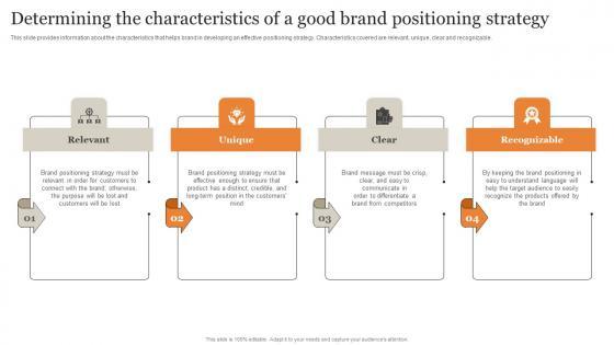 This slide provides information about the characteristics that helps brand in developing an effective positioning strategy. Characteristics covered are relevant, unique, clear and recognizable. The best PPT templates are a great way to save time, energy, and resources. Slidegeeks have 100 percent editable powerpoint slides making them incredibly versatile. With these quality presentation templates, you can create a captivating and memorable presentation by combining visually appealing slides and effectively communicating your message. Download Determining The Characteristics Of A Good Brand Positioning Ultimate Guide Implementing Designs Pdf from Slidegeeks and deliver a wonderful presentation. This slide provides information about the characteristics that helps brand in developing an effective positioning strategy. Characteristics covered are relevant, unique, clear and recognizable.