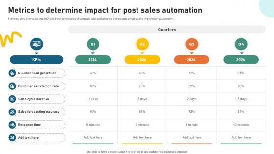 Following slide showcases major KPIs to track performance of company sales performance and evaluate progress after implementing automation. The Metrics To Determine Impact For Sample Pitch Deck For Video Ppt Powerpoint is a compilation of the most recent design trends as a series of slides. It is suitable for any subject or industry presentation, containing attractive visuals and photo spots for businesses to clearly express their messages. This template contains a variety of slides for the user to input data, such as structures to contrast two elements, bullet points, and slides for written information. Slidegeeks is prepared to create an impression. Following slide showcases major KPIs to track performance of company sales performance and evaluate progress after implementing automation.