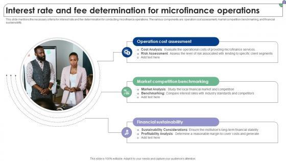 This slide mentions the necessary criteria for interest rate and fee determination for conducting microfinance operations. The various components are operation cost assessment, market competition benchmarking, and financial sustainability. Coming up with a presentation necessitates that the majority of the effort goes into the content and the message you intend to convey. The visuals of a PowerPoint presentation can only be effective if it supplements and supports the story that is being told. Keeping this in mind our experts created Interest Rate And Fee Determination For Microfinance Complete Guide To Microfinance Fin SS V to reduce the time that goes into designing the presentation. This way, you can concentrate on the message while our designers take care of providing you with the right template for the situation. This slide mentions the necessary criteria for interest rate and fee determination for conducting microfinance operations. The various components are operation cost assessment, market competition benchmarking, and financial sustainability.