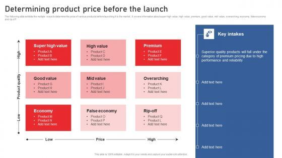 The following slide exhibits the multiple ways to determine the price of various products before launching it to the market. It covers information about super high value, high value, premium, good value, mid value, overarching, economy, false economy and rip-off. Find highly impressive Determining Product Price Before The Launch Using Red Ocean Strategies Download Pdf on Slidegeeks to deliver a meaningful presentation. You can save an ample amount of time using these presentation templates. No need to worry to prepare everything from scratch because Slidegeeks experts have already done a huge research and work for you. You need to download Determining Product Price Before The Launch Using Red Ocean Strategies Download Pdf for your upcoming presentation. All the presentation templates are 100 percent editable and you can change the color and personalize the content accordingly. Download now The following slide exhibits the multiple ways to determine the price of various products before launching it to the market. It covers information about super high value, high value, premium, good value, mid value, overarching, economy, false economy and rip-off.