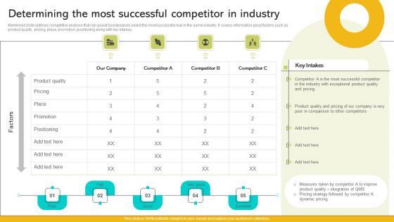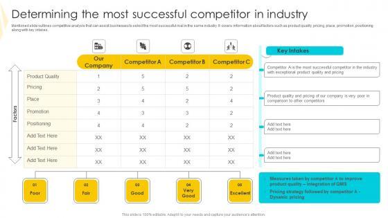 Mentioned slide outlines competitive analysis that can assist businesses to select the most successful rival in the same industry. It covers information about factors such as product quality, pricing, place, promotion, positioning along with key intakes. Crafting an eye-catching presentation has never been more straightforward. Let your presentation shine with this tasteful yet straightforward Implementing Strategies To Enhance Determining The Most Successful Competitor In Industry Download PDF template. It offers a minimalistic and classy look that is great for making a statement. The colors have been employed intelligently to add a bit of playfulness while still remaining professional. Construct the ideal Implementing Strategies To Enhance Determining The Most Successful Competitor In Industry Download PDF that effortlessly grabs the attention of your audience Begin now and be certain to wow your customers Mentioned slide outlines competitive analysis that can assist businesses to select the most successful rival in the same industry. It covers information about factors such as product quality, pricing, place, promotion, positioning along with key intakes.