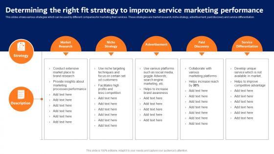 This slides shows various strategies which can be used by different companies for marketing their services. These strategies are market research, niche strategy, advertisement, paid discovery and service differentiation. Present like a pro with Service Promotion Plan Determining The Right Fit Strategy To Improve Service Marketing Template PDF Create beautiful presentations together with your team, using our easy-to-use presentation slides. Share your ideas in real-time and make changes on the fly by downloading our templates. So whether youre in the office, on the go, or in a remote location, you can stay in sync with your team and present your ideas with confidence. With Slidegeeks presentation got a whole lot easier. Grab these presentations today.