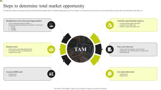 This slide showcases various steps to analyze and identify total available market to facilitate strategic planning for the company. It includes elements such as new revenue opportunities, outreach plan, achievable goals, B2B leads, etc. Pitch your topic with ease and precision using this Steps To Determine Total Market Opportunity Guidelines Pdf. This layout presents information on Icon Showcasing, Total Addressable Market Share. It is also available for immediate download and adjustment. So, changes can be made in the color, design, graphics or any other component to create a unique layout. This slide showcases various steps to analyze and identify total available market to facilitate strategic planning for the company. It includes elements such as new revenue opportunities, outreach plan, achievable goals, B2B leads, etc.