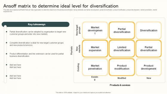 This slide showcases ansoff matrix that can help organization to determine ideal level of business diversification. Its key elements are market development, partial diversification, product modification, product development, market penetration, market expansion etc. Welcome to our selection of the Ansoff Matrix To Determine Ideal Level For Diversification Market Expansion Through Themes Pdf These are designed to help you showcase your creativity and bring your sphere to life. Planning and Innovation are essential for any business that is just starting out. This collection contains the designs that you need for your everyday presentations. All of our PowerPoints are 100 percent editable, so you can customize them to suit your needs. This multi-purpose template can be used in various situations. Grab these presentation templates today. This slide showcases ansoff matrix that can help organization to determine ideal level of business diversification. Its key elements are market development, partial diversification, product modification, product development, market penetration, market expansion etc.