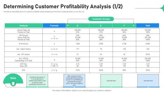 This slide provides details about how customer profitability is analyzed based upon the amount of sales generated, invoice value, etc. Slidegeeks is here to make your presentations a breeze with Determining Customer Profitability Analysis Increasing Profitability Through Better Product With our easy-to-use and customizable templates, you can focus on delivering your ideas rather than worrying about formatting. With a variety of designs to choose from, you are sure to find one that suits your needs. And with animations and unique photos, illustrations, and fonts, you can make your presentation pop. So whether you are giving a sales pitch or presenting to the board, make sure to check out Slidegeeks first This slide provides details about how customer profitability is analyzed based upon the amount of sales generated, invoice value, etc.