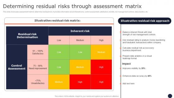 This slide showcases assessment matrix to determine residual risks. It provides information about inherent risks, control assessment, satisfaction, visibility, risk management controls, data analytics, etc. If your project calls for a presentation, then Slidegeeks is your go-to partner because we have professionally designed, easy-to-edit templates that are perfect for any presentation. After downloading, you can easily edit Techniques To Monitor Transactions Determining Residual Risks Through Assessment Matrix Diagrams PDF and make the changes accordingly. You can rearrange slides or fill them with different images. Check out all the handy templates.