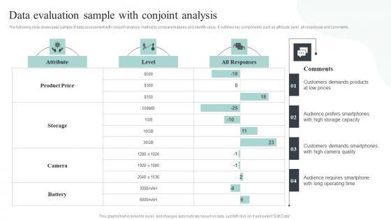 The following slide showcases sample of data assessment with conjoint analysis method to compare features and identify value. It outlines key components such as attribute, level, all responses and comments. From laying roadmaps to briefing everything in detail, our templates are perfect for you. You can set the stage with your presentation slides. All you have to do is download these easy-to-edit and customizable templates. Competitive Intelligence Guide To Determine Market Data Evaluation Sample With Conjoint Information Pdf will help you deliver an outstanding performance that everyone would remember and praise you for. Do download this presentation today. The following slide showcases sample of data assessment with conjoint analysis method to compare features and identify value. It outlines key components such as attribute, level, all responses and comments.