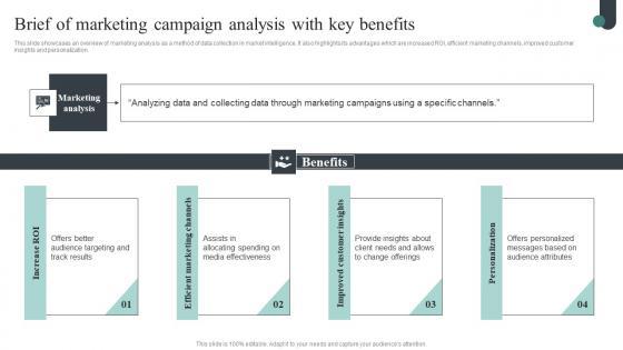 This slide showcases an overview of marketing analysis as a method of data collection in market intelligence. It also highlights its advantages which are increased ROI, efficient marketing channels, improved customer insights and personalization. Want to ace your presentation in front of a live audience Our Competitive Intelligence Guide To Determine Market Brief Of Marketing Campaign Analysis Pictures Pdf can help you do that by engaging all the users towards you. Slidegeeks experts have put their efforts and expertise into creating these impeccable powerpoint presentations so that you can communicate your ideas clearly. Moreover, all the templates are customizable, and easy-to-edit and downloadable. Use these for both personal and commercial use. This slide showcases an overview of marketing analysis as a method of data collection in market intelligence. It also highlights its advantages which are increased ROI, efficient marketing channels, improved customer insights and personalization.