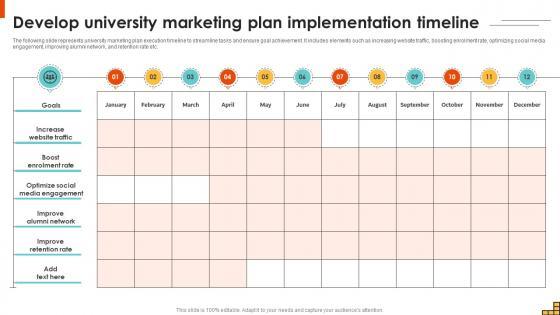 The following slide represents university marketing plan execution timeline to streamline tasks and ensure goal achievement. It includes elements such as increasing website traffic, boosting enrolment rate, optimizing social media engagement, improving alumni network, and retention rate etc. Formulating a presentation can take up a lot of effort and time, so the content and message should always be the primary focus. The visuals of the PowerPoint can enhance the presenters message, so our Develop University Marketing Plan Implementation Running Marketing Campaigns Strategy SS V was created to help save time. Instead of worrying about the design, the presenter can concentrate on the message while our designers work on creating the ideal templates for whatever situation is needed. Slidegeeks has experts for everything from amazing designs to valuable content, we have put everything into Develop University Marketing Plan Implementation Running Marketing Campaigns Strategy SS V The following slide represents university marketing plan execution timeline to streamline tasks and ensure goal achievement. It includes elements such as increasing website traffic, boosting enrolment rate, optimizing social media engagement, improving alumni network, and retention rate etc.