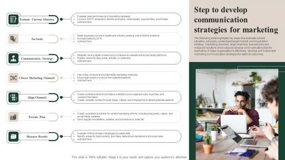 The following slide highlights key steps like evaluate current situation, set goals, understand target market, communication strategy, marketing channels, align channels, execute plan and measure results to show steps to develop communication plan for marketing. It helps organization to effectively develop and implement marketing communication strategies for optimal outcomes. Showcasing this set of slides titled Step To Develop Communication Strategies For Marketing Designs Pdf The topics addressed in these templates are Evaluate Current Situation, Communication Strategy All the content presented in this PPT design is completely editable. Download it and make adjustments in color, background, font etc. as per your unique business setting. The following slide highlights key steps like evaluate current situation, set goals, understand target market, communication strategy, marketing channels, align channels, execute plan and measure results to show steps to develop communication plan for marketing. It helps organization to effectively develop and implement marketing communication strategies for optimal outcomes.