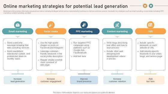 Mentioned slide provides information about various online marketing strategies which can be implemented by business to improve customer services. It includes key strategies such as email marketing, social media marketing, PPC marketing, content marketing, and SEO. The best PPT templates are a great way to save time, energy, and resources. Slidegeeks have 100 percent editable powerpoint slides making them incredibly versatile. With these quality presentation templates, you can create a captivating and memorable presentation by combining visually appealing slides and effectively communicating your message. Download Comprehensive Guide For Website Development Online Marketing Strategies For Potential from Slidegeeks and deliver a wonderful presentation. Mentioned slide provides information about various online marketing strategies which can be implemented by business to improve customer services. It includes key strategies such as email marketing, social media marketing, PPC marketing, content marketing, and SEO.