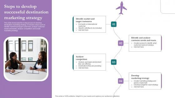 This slide showcases the 4 step process to develop destination marketing strategy. It includes steps such as identify market had target customers, analyze customer needs and wants, analyze competitors and create marketing strategy. Are you in need of a template that can accommodate all of your creative concepts This one is crafted professionally and can be altered to fit any style. Use it with Google Slides or PowerPoint. Include striking photographs, symbols, depictions, and other visuals. Fill, move around, or remove text boxes as desired. Test out color palettes and font mixtures. Edit and save your work, or work with colleagues. Download Steps To Develop Successful Comprehensive Marketing Guide For Tourism Industry Designs Pdf and observe how to make your presentation outstanding. Give an impeccable presentation to your group and make your presentation unforgettable. This slide showcases the 4 step process to develop destination marketing strategy. It includes steps such as identify market had target customers, analyze customer needs and wants, analyze competitors and create marketing strategy.