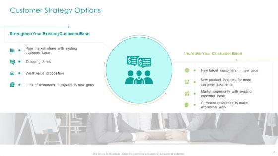 This is a developing customer service strategy customer strategy options ppt pictures gallery pdf template with various stages. Focus and dispense information on eight stages using this creative set, that comes with editable features. It contains large content boxes to add your information on topics like poor market share with existing customer base, dropping sales, weak value proposition, lack of resources to expand to new geos. You can also showcase facts, figures, and other relevant content using this PPT layout. Grab it now.