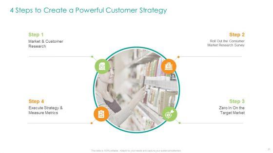 This is a developing customer service strategy 4 steps to create a powerful customer strategy guidelines pdf template with various stages. Focus and dispense information on four stages using this creative set, that comes with editable features. It contains large content boxes to add your information on topics like market and customer research, execute strategy and measure metrics. You can also showcase facts, figures, and other relevant content using this PPT layout. Grab it now.