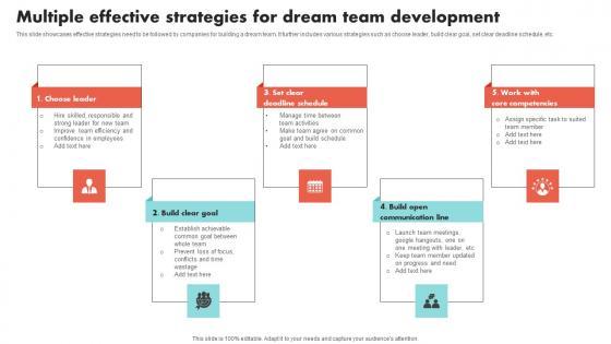 This slide showcases effective strategies need to be followed by companies for building a dream team. It further includes various strategies such as choose leader, build clear goal, set clear deadline schedule, etc.Pitch your topic with ease and precision using this Multiple Effective Strategies For Dream Team Development Demonstration Pdf This layout presents information on Choose Leader, Build Clear Goal, Communication Line It is also available for immediate download and adjustment. So, changes can be made in the color, design, graphics or any other component to create a unique layout. This slide showcases effective strategies need to be followed by companies for building a dream team. It further includes various strategies such as choose leader, build clear goal, set clear deadline schedule, etc.