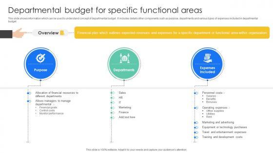 This slide shows information which can be used to understand concept of departmental budget . It includes details other components such as purpose, departments and various types of expenses included in departmental budget. If your project calls for a presentation, then Slidegeeks is your go-to partner because we have professionally designed, easy-to-edit templates that are perfect for any presentation. After downloading, you can easily edit Departmental Budget For Specific Functional Areas Effective And Efficient Tools To Develop Fin SS V and make the changes accordingly. You can rearrange slides or fill them with different images. Check out all the handy templates This slide shows information which can be used to understand concept of departmental budget . It includes details other components such as purpose, departments and various types of expenses included in departmental budget.