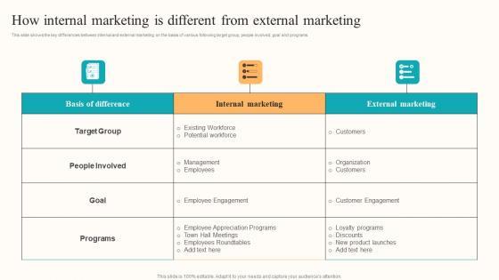 This slide shows the key differences between internal and external marketing on the basis of various following target group, people involved, goal and programs. Slidegeeks is here to make your presentations a breeze with How Internal Marketing Different Developing Employee Centric Marketing Program Sample Pdf With our easy to use and customizable templates, you can focus on delivering your ideas rather than worrying about formatting. With a variety of designs to choose from, you are sure to find one that suits your needs. And with animations and unique photos, illustrations, and fonts, you can make your presentation pop. So whether you are giving a sales pitch or presenting to the board, make sure to check out Slidegeeks first This slide shows the key differences between internal and external marketing on the basis of various following target group, people involved, goal and programs.