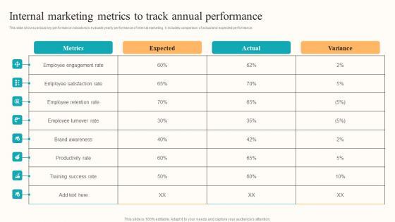 This slide shows various key performance indicators to evaluate yearly performance of internal marketing. It includes comparison of actual and expected performance. If you are looking for a format to display your unique thoughts, then the professionally designed Internal Marketing Metrics Developing Employee Centric Marketing Program Introduction Pdf is the one for you. You can use it as a Google Slides template or a PowerPoint template. Incorporate impressive visuals, symbols, images, and other charts. Modify or reorganize the text boxes as you desire. Experiment with shade schemes and font pairings. Alter, share or cooperate with other people on your work. Download Internal Marketing Metrics Developing Employee Centric Marketing Program Introduction Pdf and find out how to give a successful presentation. Present a perfect display to your team and make your presentation unforgettable. This slide shows various key performance indicators to evaluate yearly performance of internal marketing. It includes comparison of actual and expected performance.