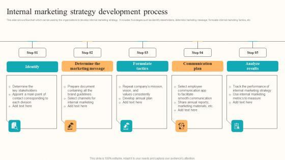 This slide shows flowchart which can be used by the organizations to develop internal marketing strategy. It includes five stages such as identify stakeholders, determine marketing message, formulate internal marketing tactics, etc. Want to ace your presentation in front of a live audience Our Implementing Internal Marketing Internal Marketing Strategy Development Process Graphics PDF can help you do that by engaging all the users towards you. Slidegeeks experts have put their efforts and expertise into creating these impeccable powerpoint presentations so that you can communicate your ideas clearly. Moreover, all the templates are customizable, and easy-to-edit and downloadable. Use these for both personal and commercial use.